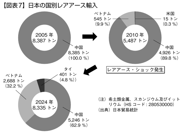 2010年からだいぶ改善されたとはいえ、今も日本のレアアース輸入量8335トンのうち、62.9%を中国が占めている(貿易統計2024年)。