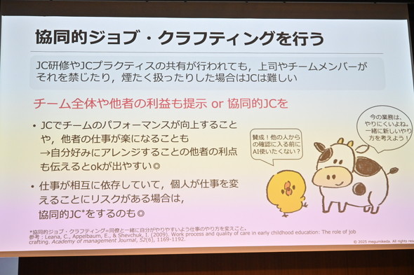 一方で「ジョブ・クラフティングは“一人前”になってから行うべき」という価値観が、若手の工夫を阻害する現状もある。しかし、上司自身が生き生きとジョブ・クラフティングをしている職場では、その姿勢が部下にも伝わると池田氏は強調する。