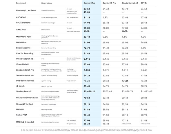 Gemini3 Proのベンチマークスコア。ほぼすべてでトップを獲得した。特に注目なのが、「ScreeenShot-Pro」ベンチで他にダブルスコア以上を付けていること。これはWeb画面などをうまく認識できるかのテストで、要するにAIがWebをしっかり操作できる時代が近づいた(出典:Google、Gemini3.0のリリース)