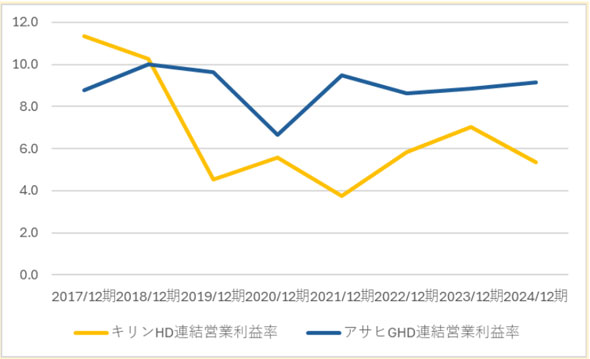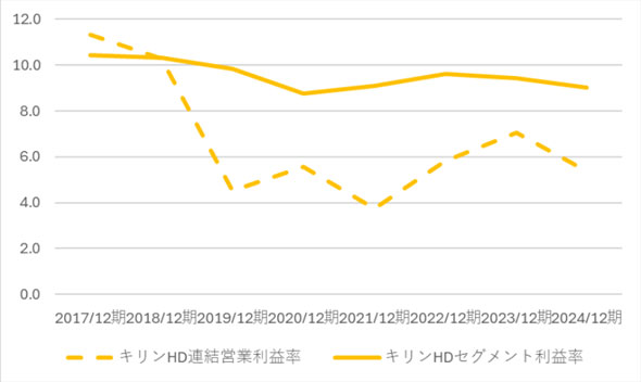 キリンはセグメントごとの利益率では比較的安定しており、数字そのものは決して悪くありません。ところが、それを連結営業利益率に換算すると大きな差が生じます。