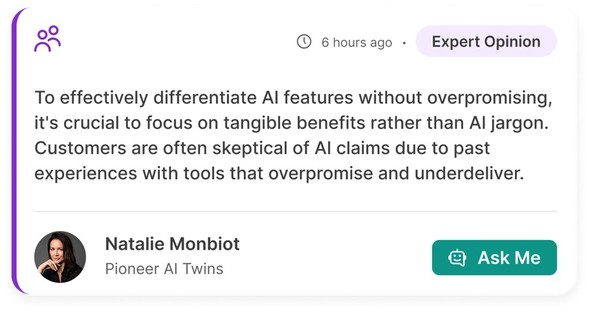 これにより、AIツインやその他の検証済み知識ソースから直接データを取得し、経営陣やチームは専門家に直接依頼することなく、即座に信頼性の高いインサイトを得られるようになった。さらに、AIツインが生成した内容をもとに、必要に応じて専門家本人とのミーティングや有料コンサルティングをワンクリックで設定できる機能も追加された。