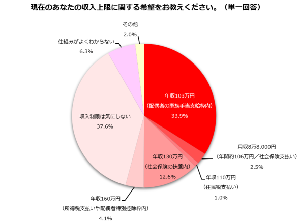 ところが、筆者が研究顧問を務めるしゅふJOB総研で、9月に仕事と家庭の両立を希望する主婦・主夫層に調査したところ、収入上限を定めている人で最も多かった金額は年収103万円でした。過去の調査と比較して、いまのところ減った印象を受けません。