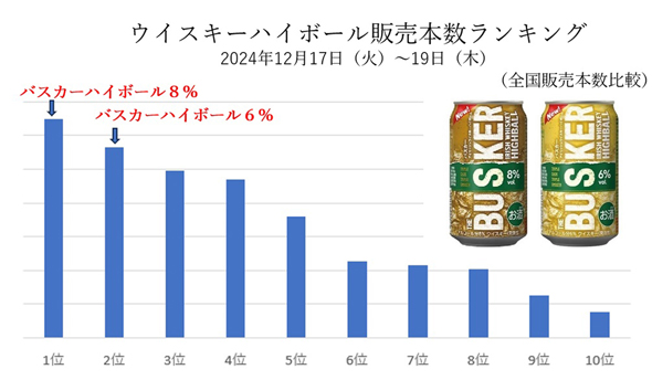 こうして、2024年12月に同社限定で「バスカーハイボール」(8%、6%の2商品)が登場した。容量は350ml缶で、価格は各328円。人気のアイリッシュウイスキー「BUSKER」を使用した高級ハイボール缶となる。