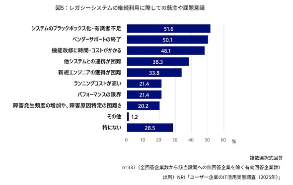 レガシーシステムを継続して利用する際の懸念や課題としては「システムのブラックボックス化や有識者の不足」(51.6%)、「ベンダーサポートの終了」(50.1%)が上位に挙がった。