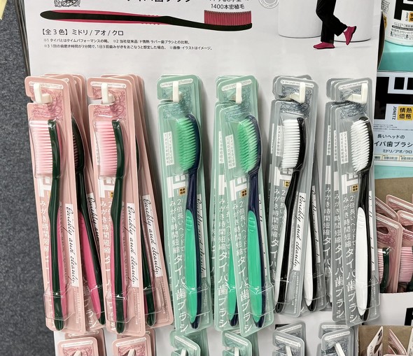 担当者によると、若者の間で入浴回数を減らす「風呂キャンセル界隈」が広がる中、アウトバス市場(浴室外で使用するケア用品の関連市場)が伸びてきているという。タイパ歯ブラシは、若い女性だけでなく、その見た目のインパクトから外国人観光客にも人気だ。