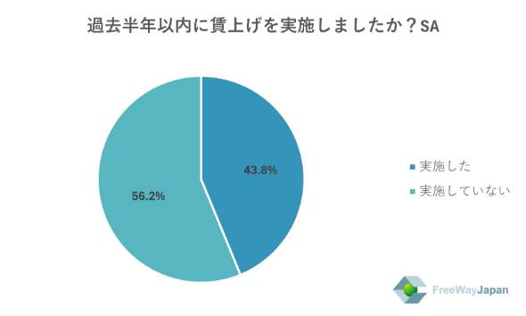 社長に過去半年以内に賃上げを実施したか聞くと、「実施していない」が56.2%、「実施した」が43.8%となった。