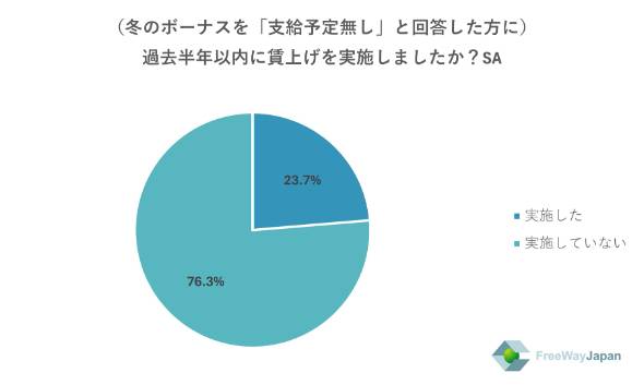 一方で冬のボーナスを「支給予定なし」と回答した人は、賃上げを「実施していない」が76.3%、「実施した」が23.7%だった。