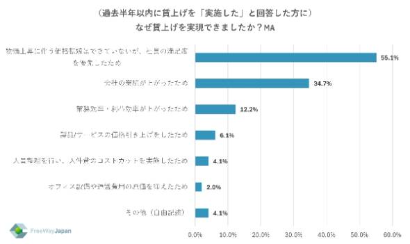 なぜ賃上げを実現できたかについては、「物価上昇に伴う価格転嫁はできていないが、社員の満足度を優先したため」(55.1%)が最も多く、「会社の業績が上がったため」(34.7%)、「業務効率・利益効率が上がったため」(12.2%)が続いた。