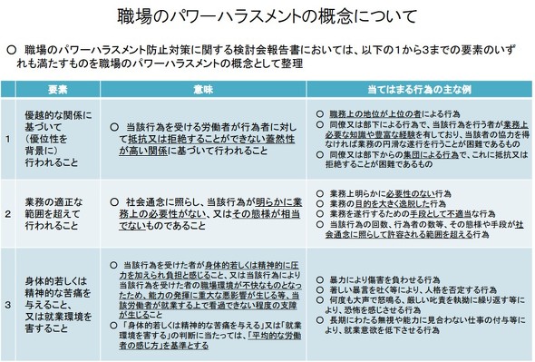 しかし今回の報告書では、厚労省の「パワハラの認定基準」に照らして、伊澤社長の言動についてのパワハラ認定根拠を明確にしている点が注目に値します。「パワハラ認定基準」では、次の3つの全てを満たすとき、パワハラと認定されると定義しています。