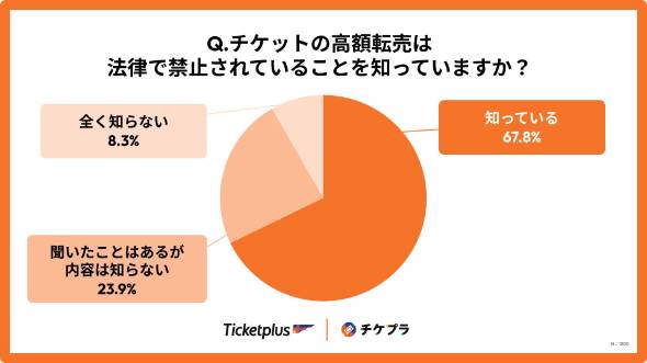 2019年施行の「チケット転売禁止法」については、「全く知らない」と回答した人が8.3%、法律を「聞いたことがあるが内容は知らない」が23.9%と、合計32.2%が法規制の存在を知らない状況にある。