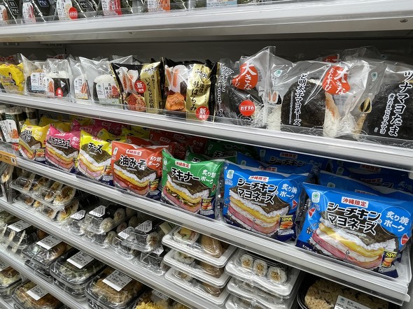 沖縄のファミリーマートの中食(弁当・おにぎり・総菜など)コーナーを見れば一目瞭然。ポーク玉子おむすびやタコス巻、沖縄そばといった地域限定商品が並ぶ。さらに見た目は全国共通商品に見えても、できる限り県民になじみ深い味わいに仕立てている。