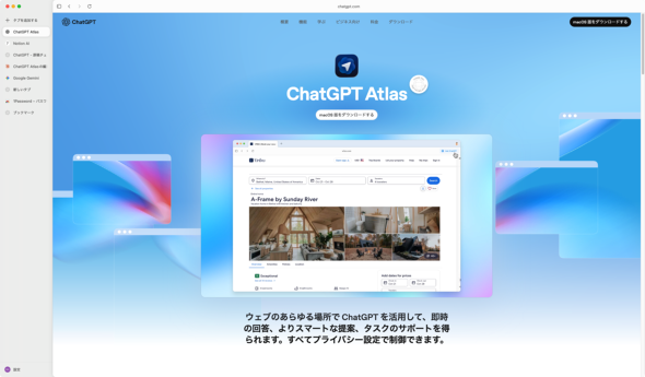 米OpenAIが2025年10月に提供を開始した「ChatGPT Atlas」は、ChatGPTを中核に据えて作られたAIブラウザだ。現時点ではMacOS向けのみ提供されている。