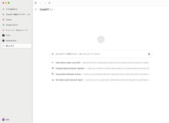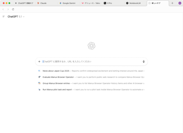 Atlasでは、新規タブがChatGPTの画面として開かれる。これだけ見ると、単に「ホーム画面がChatGPTになったブラウザ」のように見えるが、本質的な特徴は外観ではなくメモリ機能にある。