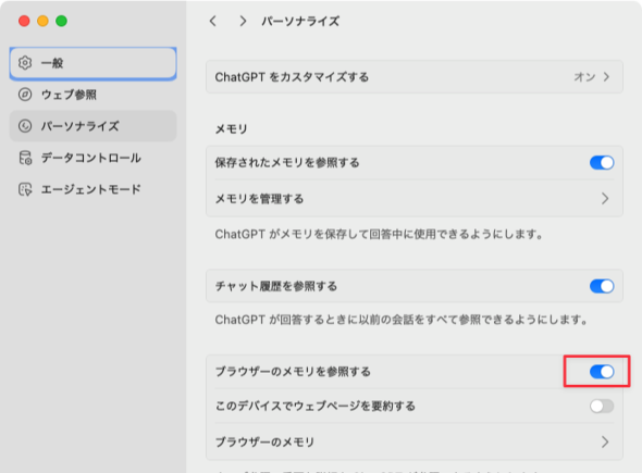 設定の「パーソナライズ」→「ブラウザのメモリを参照する」をオンにしておくと、検索によって蓄積された情報がChatGPTの回答に反映される。