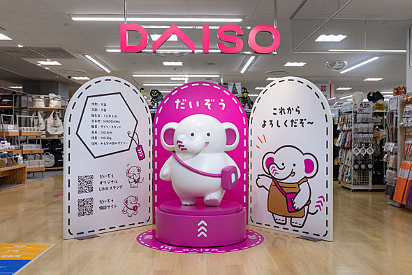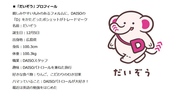 その名は「だいぞう」。象をモチーフにした、丸みのあるやさしい形が特徴だ。鼻としっぽには企業ロゴ「スリーアローズ」を取り入れ、DAISOの「D」をかたどったポシェットを身に着けている。出身地は同社の創業地である広島で、誕生日は法人設立日の12月5日。海外展開を強化することもあって「最近、英語の勉強を始めた」そうだ。
