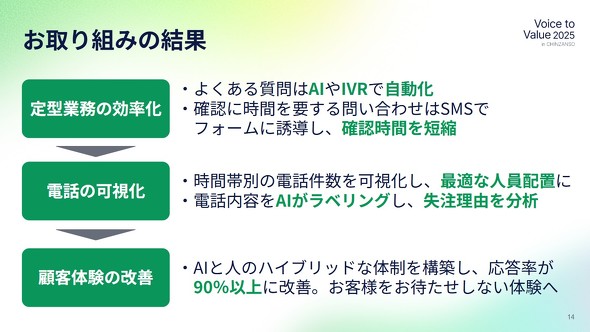 さらに、AIによるラベリング機能を活用し、どんな電話に何分かかっているのか、どの内容に時間を取られているのかも分析できるようになった。その結果をもとに、SMSで対応できるものは自動化し、録音機能を使って改善点を吸い上げるといったPDCAを回せるようになった。