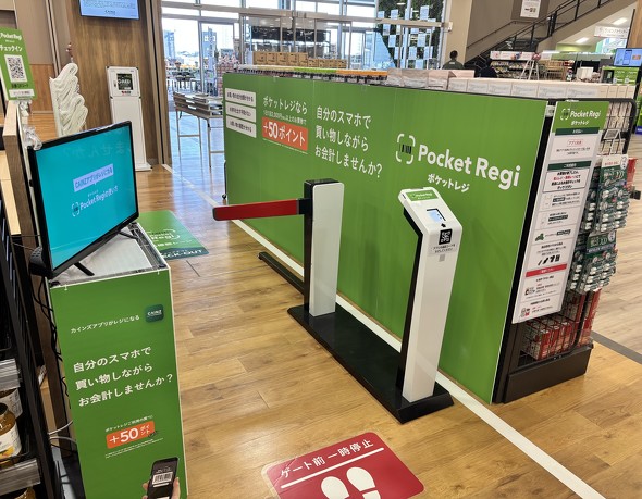 決済には、一般的なレジの他にレジを通らずにスマホで完結する「ポケットレジ」を採用した。利用客はカインズアプリでチェックインし、専用のカゴに商品を入れながら都度スマホで商品コードを読み込み、アプリ上で決済する。会計後はアプリに表示されるQRコードを専用レーンで提示するだけで買い物が完了する仕組みだ。