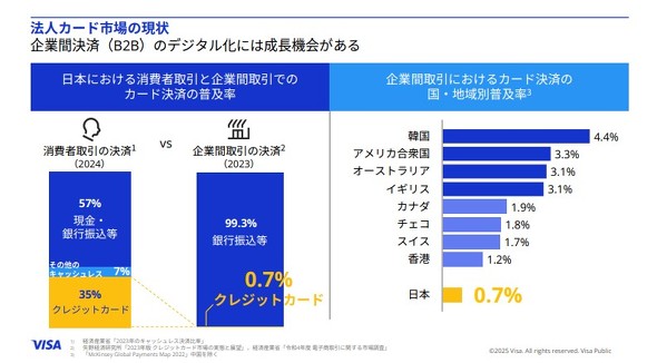 一方、より大きな成長余地があるのがBtoB決済だ。日本企業の企業間取引におけるカード決済の普及率は、わずか0.7%。韓国の4.4%、米国の3.3%と比較して著しく低い。