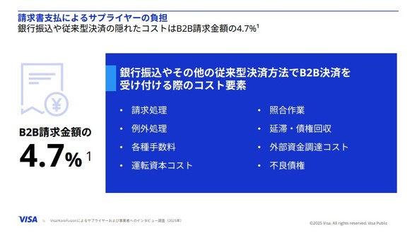 「手数料がかからない」という理由で銀行振込を選ぶ企業は多い。しかし、Visaの調査は別の現実を示す。請求書発行、消込作業、貸倒リスク、延滞債権の回収――。こうした隠れたコストを合計すると、銀行振込には「売上高の4.7%」に相当するコストが潜んでいるという。