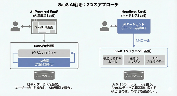 もう一つは「Headless SaaS」だ。こちらはAIエージェントがユーザーとの接点を担い、SaaSはバックエンドのデータ処理基盤に徹する。ユーザーはChatGPTのようなAIに話しかけるだけで、裏側のSaaSを意識することなく業務を完了できる。新興スタートアップが狙う領域でもある。