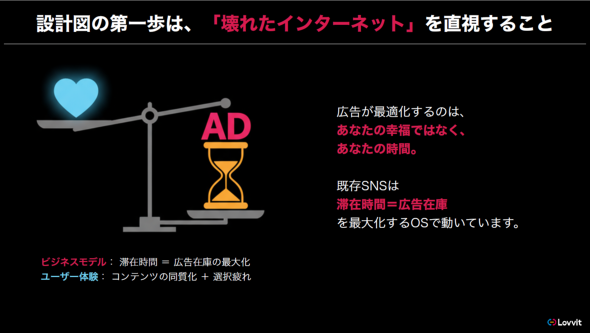 従来のSNSは滞在時間を最大化し、広告収益を得る構造が中心だった。佐藤氏はこの仕組みがユーザー体験を損なっていると指摘する。情報過多やアルゴリズム依存がユーザーを疲弊させるからだ。