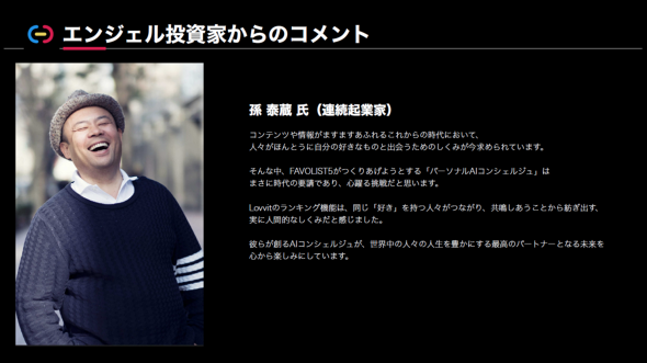 こうした有田氏のビジョンを、投資家も高く評価した。 FAVOLIST5は、すでに1.1億円の資金を調達。出資者には、ソフトバンクグループ創業者・孫正義氏の実弟で起業家・投資家として知られる孫泰蔵氏やエンジェル投資家、IT業界を代表する経営者などが名を連ねている。