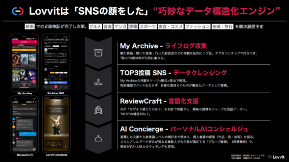サービスの特徴は、ユーザーが「心を動かされた映画トップ3」や「人生最高の寿司店トップ3」といったテーマで、ランキングを投稿する仕組みだ。AIはその理由を解析し、ユーザー自身も気付いていない「価値の差分」を浮き彫りにする。こうして育ったAIコンシェルジュは、映画や本の推薦はもちろん、食事の場や体験選びをサポートする「相棒」となるのだ。
