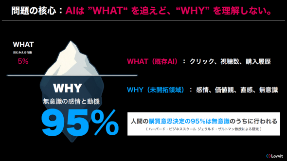 「理性は人間の中で最も新しく獲得された機能であり、むしろ言い訳を後付けするための装置でもあります。AIがこの部分だけを模倣しても、人間の本質には届きません。Lovvitが挑もうとしている感情データの可視化は、AIに残された大きなフロンティアなのです」(佐藤氏)