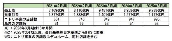 ニトリの事業単体で見ると、コロナ禍では巣ごもり需要がけん引したうえ、積極的な出店や首都圏でホームセンターを展開する島忠を完全子会社化したことで売上高が大幅に拡大した。