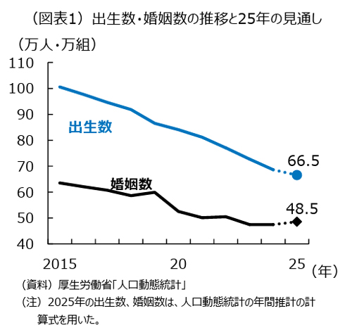 日本総合研究所が2025年12月に公表した試算でも、2025年の出生数は66.5万人で統計開始以来「最少」だという。ちなみに、2014年は約100万人だったので、この11年で34万人も新生児が減っている。