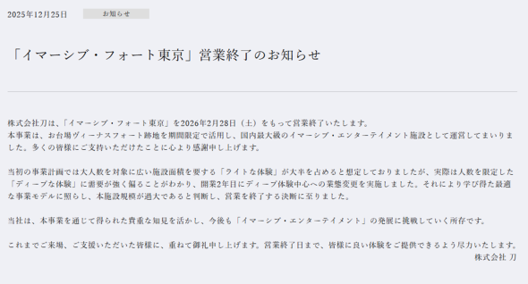 その発端は、官報に掲載された同社の決算内容が示している。第8期、第9期の連続赤字により、累積損失は62億円に達した。その影響もあって同社が企画・運営する東京・湾岸エリアのテーマパーク「イマーシブ・フォート東京」が、オープンから2年足らずの2026年2月で営業終了となる。
