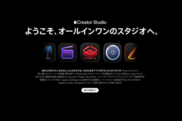 Appleが2026年1月に提供を始めた「Apple Creator Studio」は、動画・音楽・写真の編集ツールと各種テンプレートなどを利用できる定額サービスだ。「Final Cut Pro」「Logic Pro」といった同社のクリエイティブツールをまとめて定額利用できるようにしたもので、MacおよびiPadでの利用を前提としている。月額1780円と価格が手頃なことも注目を集めている。