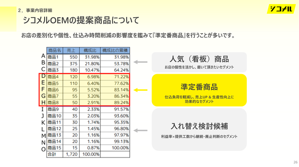 シコメルを導入している店舗では、どのようにシコメルに依頼する仕込み済み食材を決めているのか。川本氏は「ABC分析」という考え方を例に説明した。