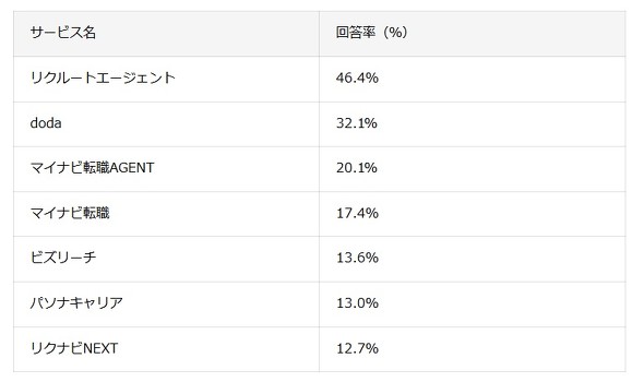 転職活動において活用したサービス(ハローワークなどの公的機関を除く)は「リクルートエージェント」が最も多く46.4%に達した。以降「doda」(32.1%)、「マイナビ転職AGENT」(20.1%)、「マイナビ転職」(17.4%)が続いた。
