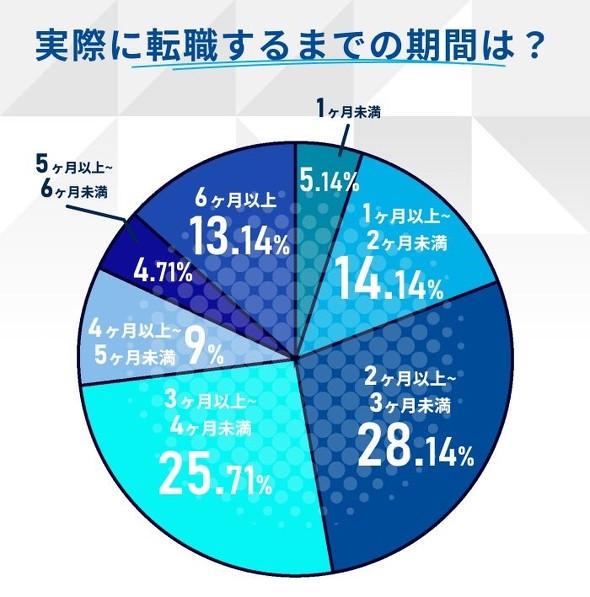 転職サービスに登録してから、実際に転職するまでの期間は「2カ月以上3カ月未満」(28.1%)、「3カ月以上4カ月未満」(25.7%)が約半数を占めた。一方で「6カ月以上」(13.1%)とじっくりと時間をかけている層も一定数見られた。