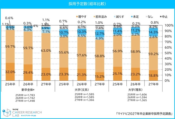 同社が今年1〜2月に全国約1600社から回答を得た調査結果によると、27年卒の採用予定数は新卒全体、文系、理系のいずれのカテゴリーにおいても「増やす」と答えた企業が減少し「前年並み」が増加した。上場、非上場を問わず、同様の傾向が見られた。