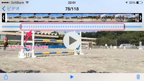 iPhoneでスローモーション動画を再生すると、まずこの画面になる。馬術障害競技の一幕である。