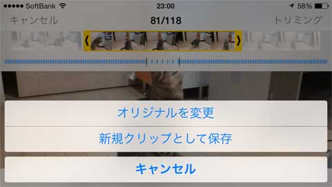 スロー部分調整と違うのは、トリミングした時点で元映像を上書きしちゃうか、別のビデオクリップとして保存するか選べるところ。一度保存しちゃうとやり直しはきかないので、元映像を残しておきたい人は後者を選ぶべし。