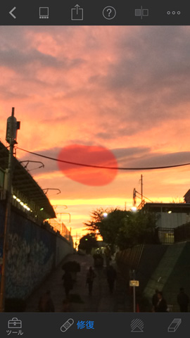 もうひとつ面白いのが「修復ブラシ」機能。ブラシの中にある「修復」がそうなんだけど、これも試してみよう。すごくきれいな夕焼けを発見したので撮ってみたのだ。