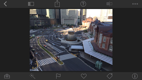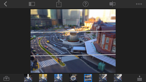 建物の上から、東京駅前を見下ろした写真だ。彩度を上げて派手目にして、さらには明るさを調節。そこにアートフィルタのミニチュア効果をかける。