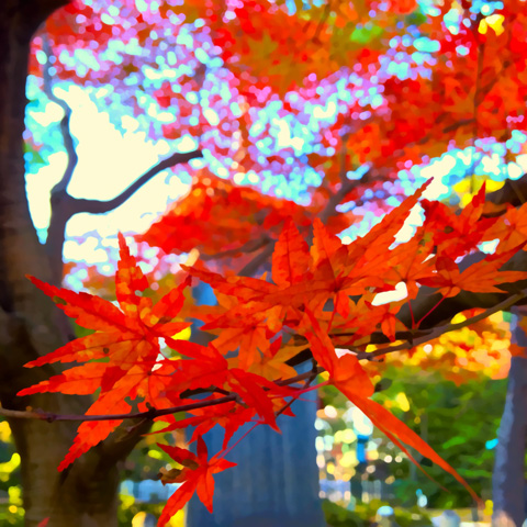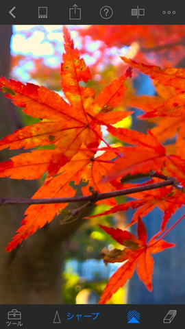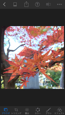 さらに背景をボカしたり、背景の色を弱めて手前のモミジを強調させたりしてもいいかもしれないけど、今回はしてません。iPhoneの画面でそんな細かい補正までするのかといわれると微妙なとこではあるし、なかなか狙った効果を出すのは難しい。