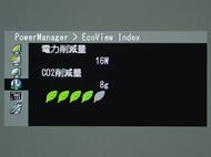 内蔵の外光センサーを利用した自動調光機能「Auto EcoView」(画像=左)や、電力/CO2削減量を表示する機能「EcoView Index」(画像=中央)も備えている。普段使わないカラーモードは、MODEボタンを押したときに表示しないよう設定することもできる(画像=右)Copyright © ITmedia, Inc. All Rights Reserved.