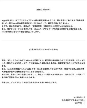 「Apple社に対し、本アプリのアップデート版を審査申請したところ、既に配信しております『黄昏流星群』の一部がApple社の審査基準に従っていないとして、審査不合格となりました。そこで、誠に残念ながら、本日より『黄昏流星群』を販売停止とさせていただきました。(以下略)」(2012年3月21日付けでユーザーに告知された『BIG COMICS』の『重要なお知らせ』より)