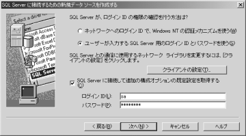 「ユーザが入力するSQL Server用のログインIDとパスワードを使う」を選択し、ログイン可能なIDとパスワードを入力して「次へ」をクリックします。