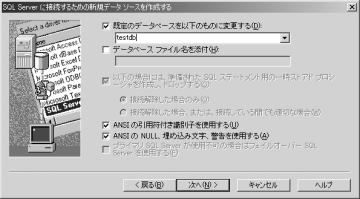 「既定のデータベースを以下のものに変更する」をチェックし、使用するデータベース(ここではtestdb)を選択して「次へ」をクリックします。