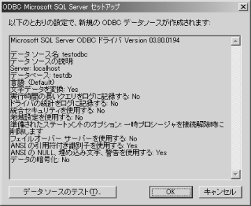 「testodbc」が追加されていることを確認し、「OK」をクリックして画面を閉じます。