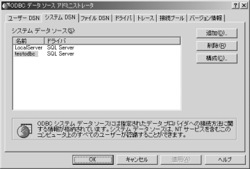 ODBC経由でデータベースへ接続するには、ODBCデータソースを設定する必要があります。ここでは、SQL Serverのデータベース「testdb」を「testodbc」という名前で定義する例を取り上げます。