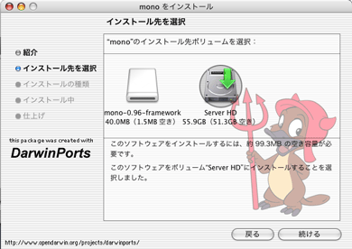 このパッケージファイルをダブルクリックしてインストールすると、画面2のようにインストーラが起動する。インストーラに示されている通りにインストールを進めれば、/Library/Frameworks/ディレクトリ下に、Mono.framework/ディレクトリができ、その下にMonoの基本パッケージがインストールされる。