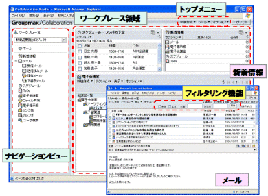図3には代表的な画面を示した。各種コンテンツにアクセスするためのナビゲーションビューに、メール、スケジュール、ToDo、電子会議室、ファイル共有(WebDAV利用)、電子掲示板などの基本機能を配し、初めてのユーザにも習熟しやすい構成になっている。また、オプションとして、IP電話連携やTV会議連携といった機能も実現し、リアルタイムなコラボレーションも実現している。