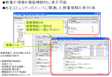 導入ポイントとしては、コミュニティ管理と呼んでいる特長的なチーム管理機能とポータルをミックスした「ワークプレース」がニーズにマッチしたという。さらに図4に示すような新着情報機能で電子メール、電子掲示板の最新のものが件数表示できる機能が、見落しを防止するのに役立つと評判がよく、さらにはポータルによる洗練されたGUIの実装が高い評価を得ることができたという。